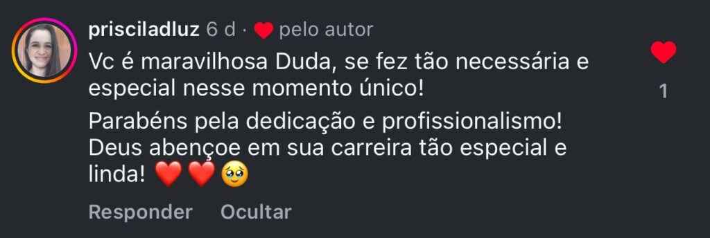 Sou Eduarda, mãe da Olívia, e a maternidade despertou em mim o propósito de cuidar, acolher e empoderar outras mulheres. Como doula, caminho ao lado de cada gestante com respeito e carinho, tornando o parto uma experiência mais humana, consciente e cheia de amor.